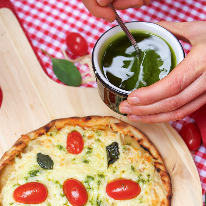 Um festival de manjericão fresco, molho pesto, tomate cereja.